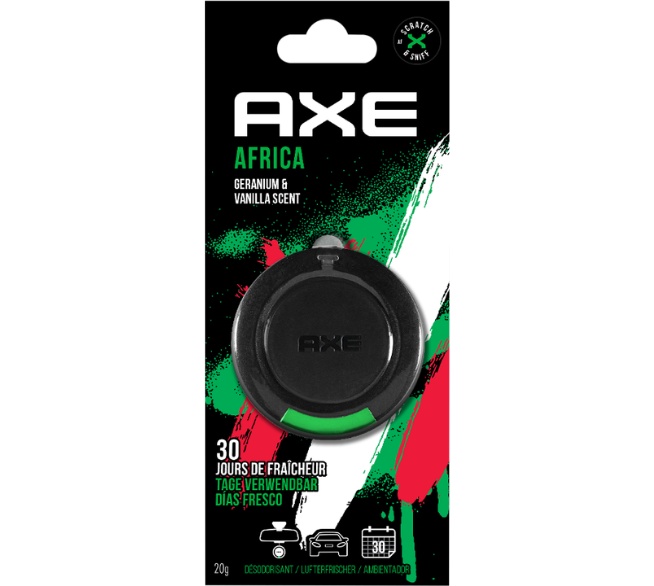 Hol dir den unverwechselbaren AXE Afrika Duft in deinen Innenraum. Warme, würzige Noten sorgen für ein markantes Fahrerlebnis und eine Atmosphäre, die Eindruck hinterlässt.