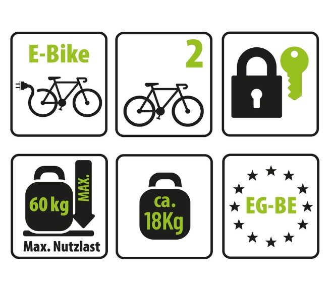 | Anzahl Räder: | für 2 Fahrräder, E-Bike Eignung |