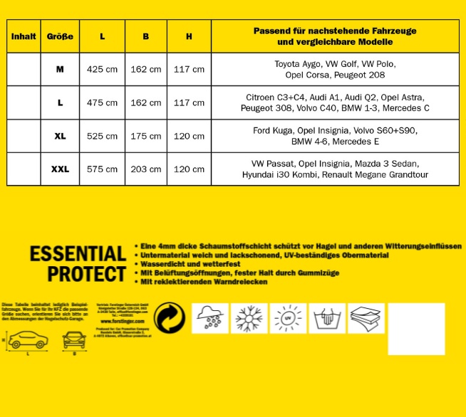 Mit der FORSTINGER Essential Protect Vollgarage bist du bestens auf plötzliche Wetterumschwünge vorbereitet. Die 4 mm starke Schaumstoffschicht schützt gezielt empfindliche Fahrzeugbereiche wie Dach, Motorhaube und Heck – ideal für den kurzfristigen Einsatz bei Hagel und Unwetter.