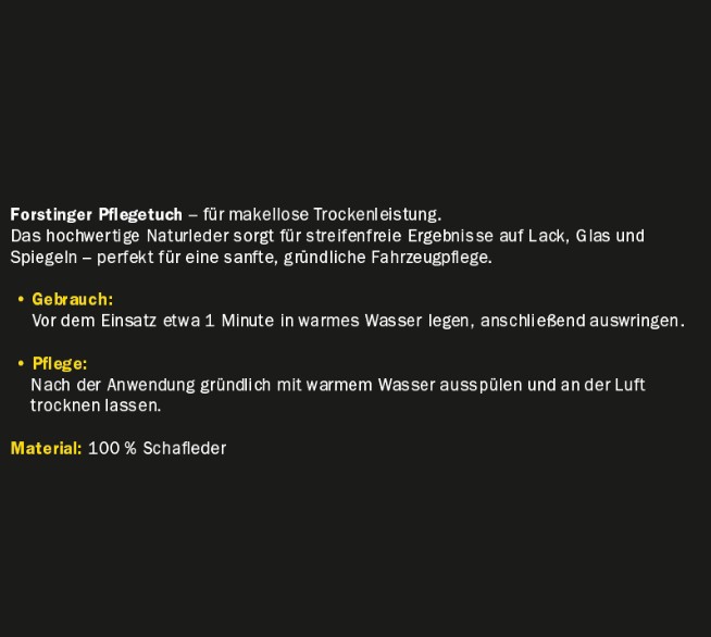 Du willst Lack, Glas und Spiegel schonend trocknen und dabei ein sauberes, streifenfreies Ergebnis erzielen? Mit dem FORSTINGER Premium Pflegetuch aus Naturleder pflegst du dein Fahrzeug besonders gründlich und materialschonend.