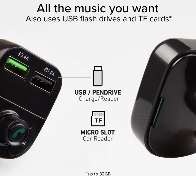 - Kabellose Verbindung zum Autoradio über FM-Frequenz