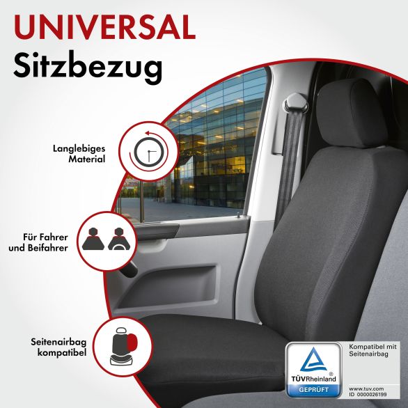 Sie sind täglich mit Ihrem Transporter unterwegs und steigen oft ein und aus. Oder Sie verbringen einen langen Tag auf der Baustelle und setzen sich am Abend mit dreckiger Arbeitskleidung in Ihr Fahrzeug. Somit ist die Beanspruchung der Sitzpolsterung sehr hoch und Sie wollen sich nicht jeden Tag Gedanken um die Verschmutzung oder Abnutzung der Autositze machen. Der Transporter Sitzbezug Toronto setzt genau hier an und hat folgenden Lieferumfang: 1 Einzelsitzbezug vorne, 1 Kopfstützenbezug