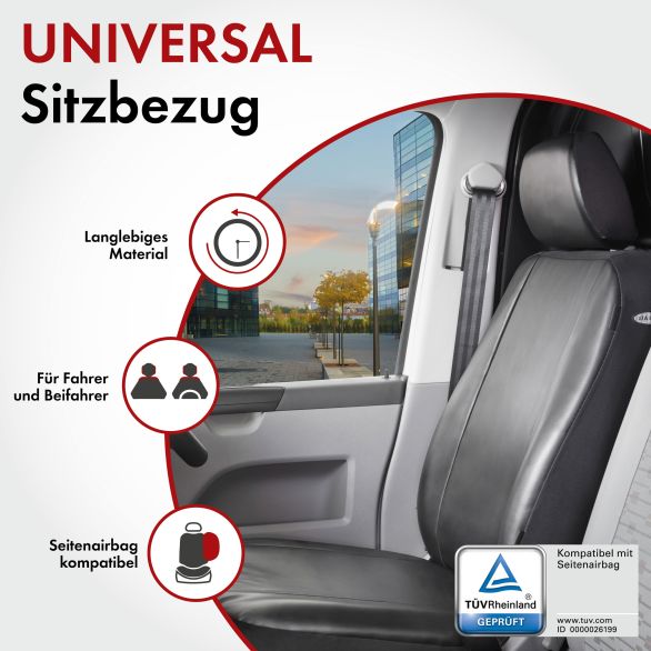 Sie sind täglich mit Ihrem Transporter oder PKW unterwegs und steigen oft ein und aus. Oder Sie verbringen einen langen Tag auf der Baustelle und setzen sich am Abend mit dreckiger Arbeitskleidung in Ihr Fahrzeug. Somit ist die Beanspruchung der Sitzpolsterung sehr hoch und Sie wollen sich nicht jeden Tag Gedanken um die Verschmutzung oder Abnutzung der Autositze machen. Der Transporter und PKW Sitzbezug Toronto setzt genau hier an und hat folgenden Lieferumfang: 1 Einzelsitzbezug vorne, 1 Kopfstützenbezug