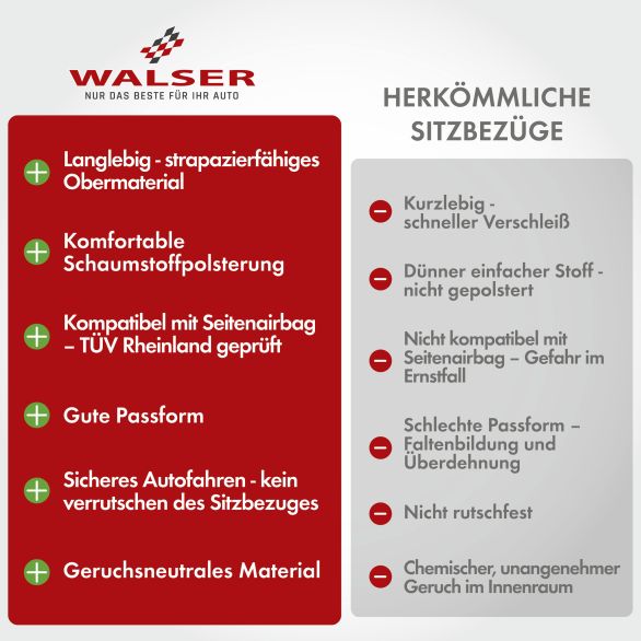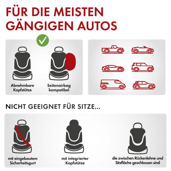 Der Vordersitzbezug ist mit dem CLIX III System ausgestattet und somit für alle Autositze mit integriertem Seitenairbag geeignet. Dies kann im Ernstfall Leben retten und Sie und Ihre Passagiere sind stets sicher unterwegs. Das sorgt für ein gutes Gefühl bei jeder Fahrt.