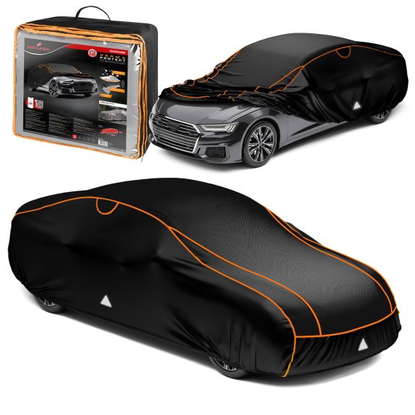 Die Hagelschutzplane ist mit einer 4 mm dicken Neopren Schaumstoffschicht gepolstert. Diese absorbiert die Wucht des Hagelaufpralls sehr gut, wodurch die Motorhaube, das Dach und der Kofferraum bestens vor Hagelschlag geschützt sind. Insgesamt hat die Hagelschutzplane eine Stärke von ca. 5 mm. Das Produkt ist wasserabweisend und hat an der Innenseite ein lackschonendes Fleece. Außen sind vier Reflektoren angebracht und die ultra orangen Einfassbänder erhöhen die Sichtbarkeit zusätzlich. Darüber hinaus gibt es zwei Ventilationsöffnungen, um eine gute Durchlüftung zu garantieren.