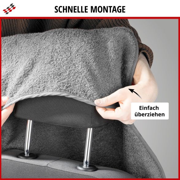 Das Multicover mit integrierter Kopfstütze ist sehr einfach zu beziehen. Sie stülpen den Sitzaufleger einfach über die Kopfstütze, legen ihn schön auf den Autositz und schließen den Schnappverschluss hinter dem Sitz. Schon ist der Bezug bereit für seinen Einsatz.