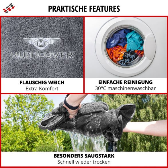 Das Multicover wird aus hochwertigem 100% Polyester gefertigt und ist bei 30°C waschbar. Das flauschig weiche Material ist atmungsaktiv und besonders saugstark, weshalb es Wasser gut aufnimmt und die Umgebung trocken hält. Zusätzlich ist das Multicover für Autositze mit integriertem Seitenairbag geeignet.