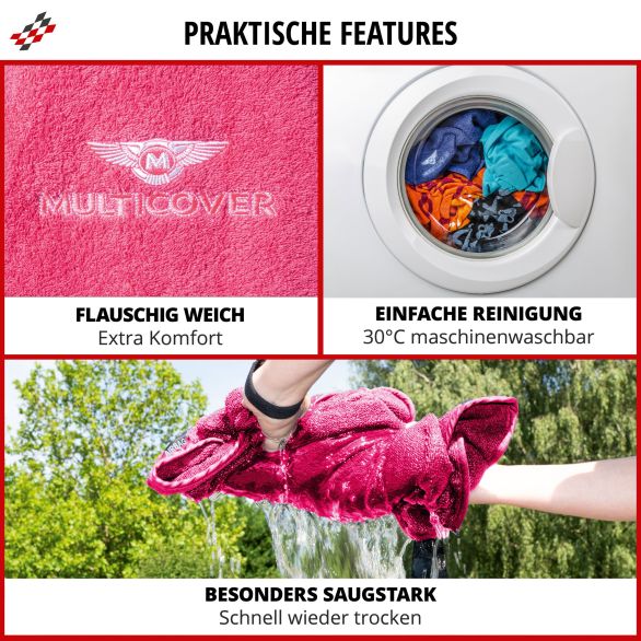 Das Multicover wird aus hochwertigem 100% Polyester gefertigt und ist bei 30°C waschbar. Das flauschig weiche Material ist atmungsaktiv und besonders saugstark, weshalb es Wasser gut aufnimmt und die Umgebung trocken hält. Zusätzlich ist das Multicover für Autositze mit integriertem Seitenairbag geeignet.