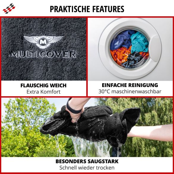 Das Multicover wird aus hochwertigem 100% Polyester gefertigt und ist bei 30°C waschbar. Das flauschig weiche Material ist atmungsaktiv und besonders saugstark, weshalb es Wasser gut aufnimmt und die Umgebung trocken hält. Zusätzlich ist das Multicover für Autositze mit integriertem Seitenairbag geeignet.