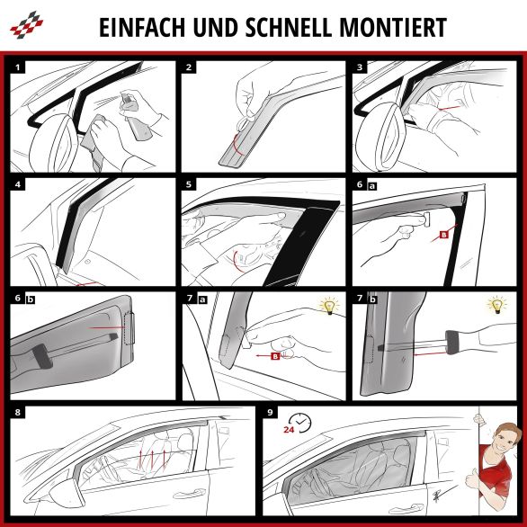 Die Windabweiser sind einfach zu montieren und sind zudem mit speziellen Clips vor Diebstahl geschützt. Sie werden aus dem robusten und langlebigen Material PMMA hergestellt, das für seine UV-Beständigkeit, Kratzfestigkeit und einfache Reinigung bekannt ist. So können die Windabweiser lange Zeit in einwandfreiem Zustand gehalten werden. Info: Die Windabweiser sind auch für die Waschstraße geeignet.