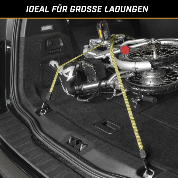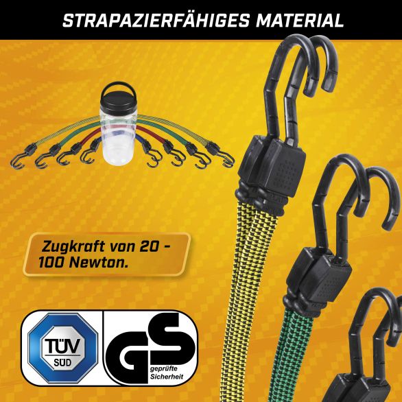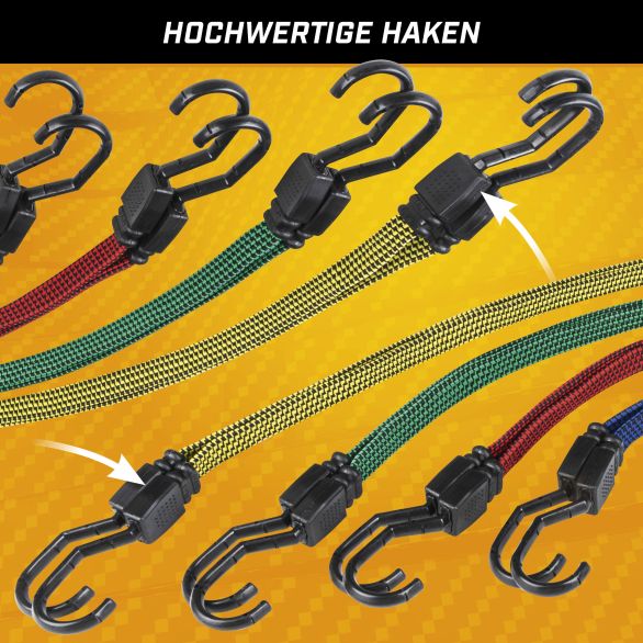 Die Gepäckspanner sind aus sehr strapazierfähigem Material gefertigt und sind gut geeignet um Ihr Ladegut im Kofferraum, auf dem Fahrrad oder Motorrad mitzuführen und sicher zu befestigen. Die unterschiedlichen Längen im Set haben eine Zugkraft von 20 - 100 Newton. Zusätzlich sind an beiden Enden der Gepäckspanner hochwertige Stahlhaken befestigt, um das Ladegut straff zu fixieren und ein herumrutschen zu verhindern. Die Spanngurte sind in mehreren unterschiedlichen Längen und Farben verfügbar und lassen sich je nach Grundlänge auf ca. die doppelte Länge spannen.