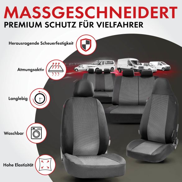 Suchen Sie einen Sitzbezug, der sehr gut passt und von Vielfahrern getestet wurde, um ultimativer Belastung standzuhalten? Unsere universalen Bezüge für Ihren Transporter sind aus hochwertigem Jacquard-Material gefertigt und passen perfekt auf Ihre Autositze. Das Material zeichnet sich durch herausragende Scheuerfestigkeit aus. WALSER Performer – absolute Premium-Qualität für Spitzenleistung in extremsten Situationen.