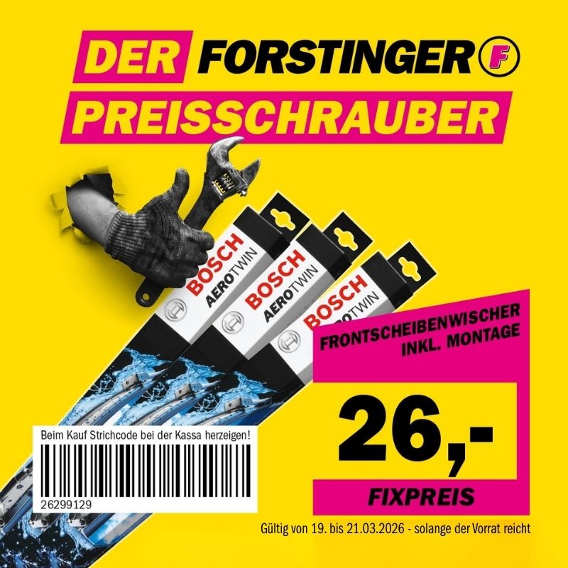 Frontscheibenwischer inkl. Montage zum Fixpreis von 26€. Gültig auf alle lagernden Frontscheibenwischer von 19.03. bis 21.03. in deiner FORSTINGER Filiale. Beim Kauf den Code an der Kassa vorzeigen. Pro Einkauf maximal 2 Stück. Solange der Vorrat reicht. Nicht kombinierbar mit anderen Aktionen, Produkt- oder Rabattgutscheinen. Keine Barablöse. Nähere Infos in deiner FORSTINGER Filiale.