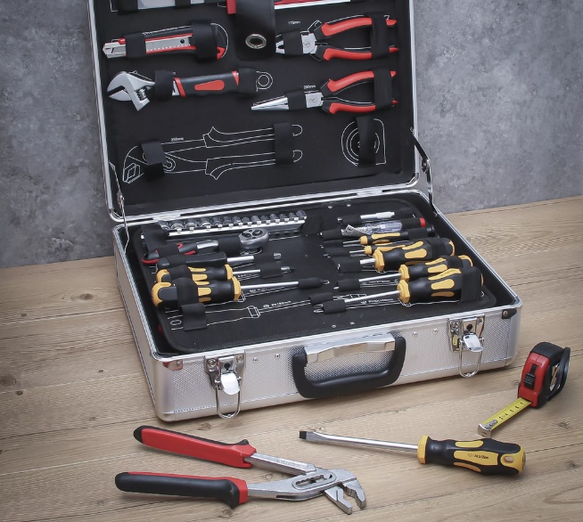 Ob Schrauben, Sägen, Messen oder Montieren – mit diesem umfangreichen Werkzeugkoffer hast du jederzeit das passende Werkzeug zur Hand.