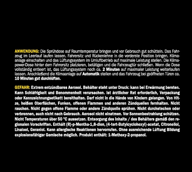 | Gefahrenhinweise: | H222 Extrem entzündbares Aerosol, H229 Behälter steht unter Druck: kann bei Erwärmung bersten., H336 Kann Schläfrigkeit und Benommenheit verursachen |