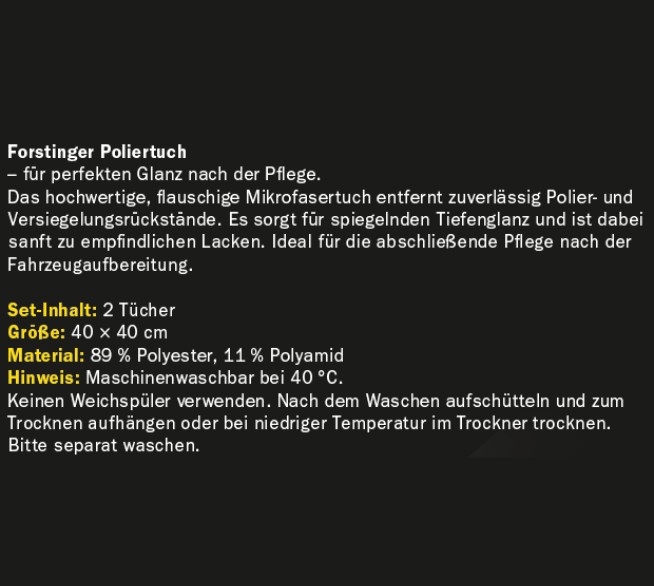 Du willst deinem Fahrzeug den letzten Schliff verleihen? Mit dem FORSTINGER Poliertuch entfernst du Politur- und Wachsreste mühelos und erzielst einen beeindruckenden Tiefenglanz.