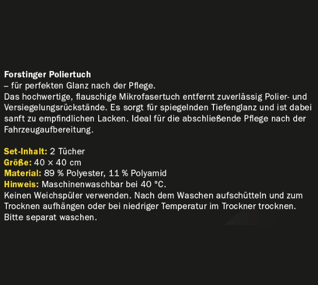 Du willst deinem Fahrzeug den perfekten Glanz verleihen? Mit dem FORSTINGER Poliertuch entfernst du Politur- und Wachsreste mühelos und erzielst ein makelloses Finish.