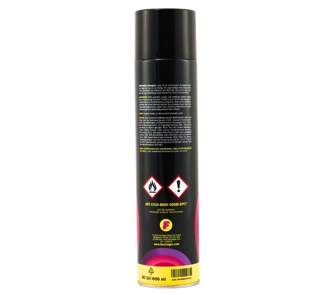 | Sicherheitshinweise: | P102 Darf nicht in die Hände von Kindern gelangen, P210 Von Hitze, heißen Oberflächen, Funken, offenen Flammen sowie anderen Zündquellenarten fernhalten. Nicht rauchen, P211 Nicht gegen offene Flamme oder andere Zündquelle sprühen, P251 Nicht durchstechen oder verbrennen, auch nicht nach Gebrauch, P260 Staub / Rauch / Gas / Nebel / Dampf / Aerosol nicht einatmen, P410+P412 Vor Sonnenbestrahlung schützen und nicht Temperaturen von mehr als 50 °C/122 °F aussetzen, P501 Inhalt/Behälter der öffentlichen Abfallentsorgung oder Recyclingeinrichtung zuführen |