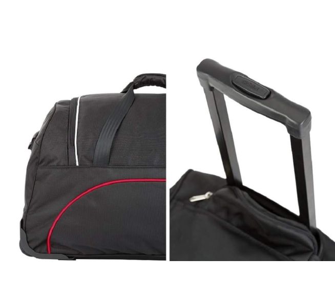 Ausgestattet mit Gummirädern und einem Teleskopgriff eignet sich die Tasche sowohl für Flugreisen als auch für Wochenendausflüge. Ein spezielles Fach ermöglicht die Aufbewahrung von Gegenständen, die getrennt werden müssen, wie Schuhe oder Sportausrüstung.