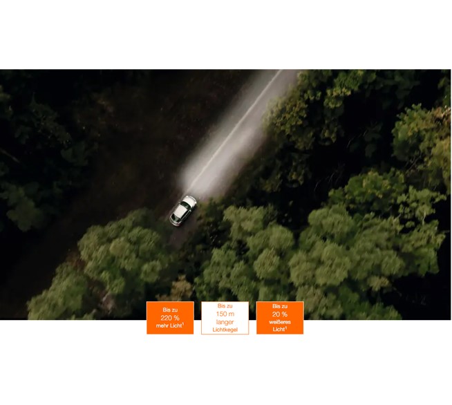 Diese Hochleistungslampe bietet bis zu 220 % mehr Helligkeit und eine bis zu 150 Meter lange Reichweite – perfekt für klare Sicht und schnelle Reaktionszeiten.