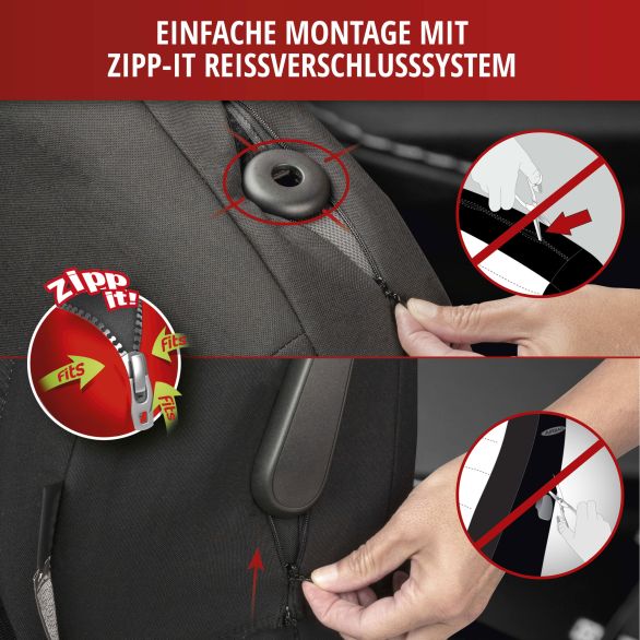 Die Sitzbezüge haben neben modernem Design und hoher Qualität noch mehr zu bieten. Die Montage der Sitzbezüge ist sehr einfach gestaltet und schnell erledigt. Nach der Entfernung der Kopfstützen können Sie die Bezüge einfach über die Sitze streifen und unter dem Sitz mit Häkchen fixieren. Durch das integrierte Zipp-It Reißverschlusssystem können die Kopfstützen ohne Einschneiden schön eingepasst werden. Das hochwertige Material ist strapazierfähig und kann einfach gereinigt werden. So hält der Sitzbezug besonders lange und macht jede Reise zu einem angenehmen Erlebnis!