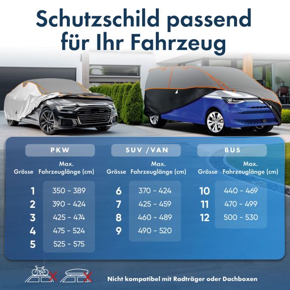 Die Plane wird in fünf unterschiedlichen Größen hergestellt und ist durch elastische Nähte relativ einfach zu beziehen. Befestigen Sie die Hagelschutzplane mit dem eingenähten Pfeil nach vorne an der Unterseite des Autos mit dem angenähten Schnappverschluss. Montieren Sie die Hagelschutzplane nur auf geparkte Fahrzeuge auf nicht öffentlichen Verkehrsflächen und entfernen Sie sie unverzüglich nachdem das Unwetter vorbei ist. Bitte beachten Sie, dass sich unter der Abdeckung Kondenswasser und Feuchtigkeit bilden kann, wenn es für längere Zeit stark regnet und sich viel Feuchtigkeit in der Luft und im Boden befindet. Auch bei stark schwankenden Temperaturen, kann sich unter der Abdeckung Kondenswasser bilden. Dies passiert unabhängig davon, ob die Plane wasserdicht ist oder nicht. Deshalb ist es umso wichtiger, die Plane regelmäßig vom Auto zu nehmen, zu lüften und zu trocknen.