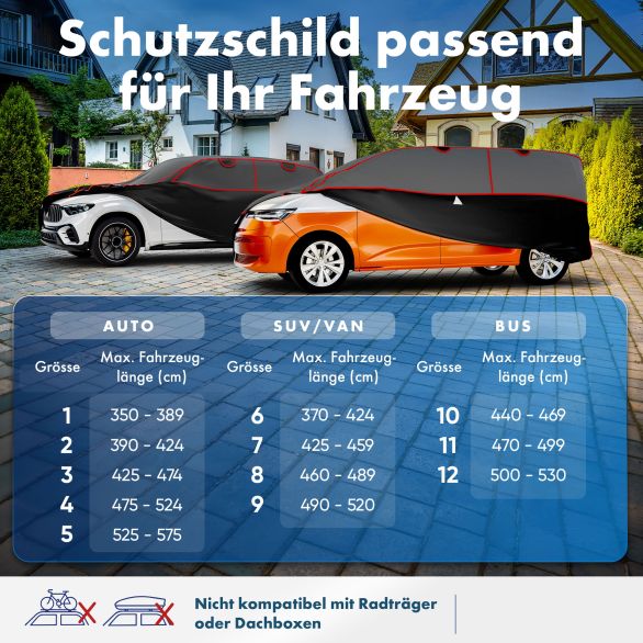 Die Plane wird in fünf unterschiedlichen Größen hergestellt und ist durch elastische Nähte relativ einfach zu beziehen. An der Unterseite des Autos wird die Hagelschutzgarage mittels eines Schnappverschlusses befestigt, damit sie nicht weggeweht werden kann. Montieren Sie die Hagelschutzplane nur auf geparkte Fahrzeuge auf nicht öffentlichen Verkehrsflächen und entfernen Sie sie unverzüglich nachdem das Unwetter vorbei ist. Bitte beachten Sie, dass sich unter der Abdeckung Kondenswasser und Feuchtigkeit bilden kann, wenn es für längere Zeit stark regnet und sich viel Feuchtigkeit in der Luft und im Boden befindet. Auch bei stark schwankenden Temperaturen, kann sich unter der Abdeckung Kondenswasser bilden. Dies passiert unabhängig davon, ob die Plane wasserdicht ist oder nicht. Deshalb ist es umso wichtiger, die Plane regelmäßig vom Auto zu nehmen, zu lüften und zu trocknen.