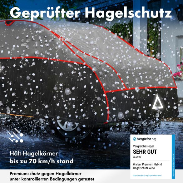 Die Schutzwirkung der Hagelschutzplane Premium Hybrid wurde unter kontrollierten Bedingungen durch einen simulierten Hagelbeschuss mittels Fallversuch getestet. Dabei wurden Stahlkugeln mit 3 unterschiedlichen Gewichten aus verschiedenen Höhen auf eine, mit einer Hagelschutzplane bedeckte Motorhaube fallen gelassen. Anschließend wurde die Wirkung des Einschlages der Stahlkugeln anhand der Dellenbildung auf der Motorhaube visuell geprüft. Die Untersuchungsergebnisse zeigten, dass die Hagelschutzplane Premium Hybrid Schutz vor Hagelkörnern, bis zu einer Größe von ca. 14mm Durchmesser, bei einer Aufprallgeschwindigkeit von 70km/h, gibt.