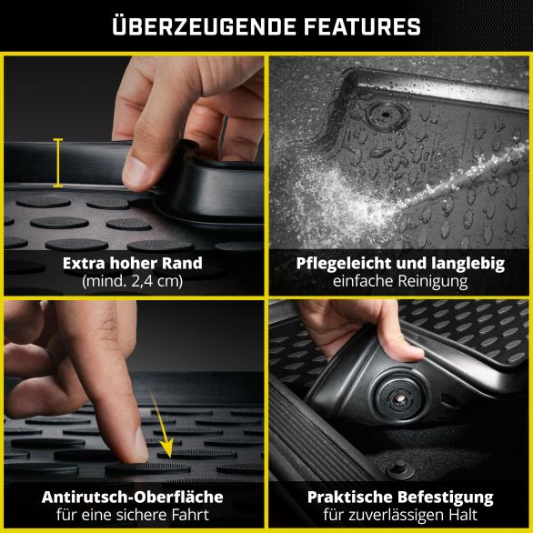 Die passgenaue Form der Gummimatte ist die ideale Ergänzung für dein Fahrzeug, sollten die Originalmatten kaputt werden. Das Produkt wird inklusive der originalen Befestigung geliefert, um eine sichere Fixierung zu garantieren. Die Matte hat auch einen sehr hohen Rand (mind. 2,4 cm) und fängt Wasser und Schmutz dadurch gezielt auf. Darüber hinaus ist sie leicht zu reinigen und hält den Fußraum deines PKW's lange sauber und trocken.