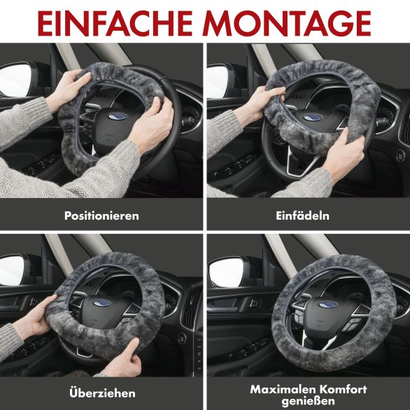 Der Lenkradbezug wird aus 100% echtem Lammfell hergestellt und überzeugt mit erstklassiger Verarbeitung. Aufgrund der Ausführung mit elastischen Bändern lässt sich der Lenkradbezug auf alle Lenkräder in der Größe von ca. 37-39 cm Durchmesser aufziehen. Somit ist der Bezug für die meisten gängigen Lenkradgrößen passend. Innen ist das Produkt schön kaschiert und passt sich optimal dem Lenkrad an.