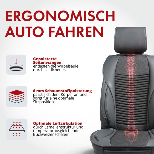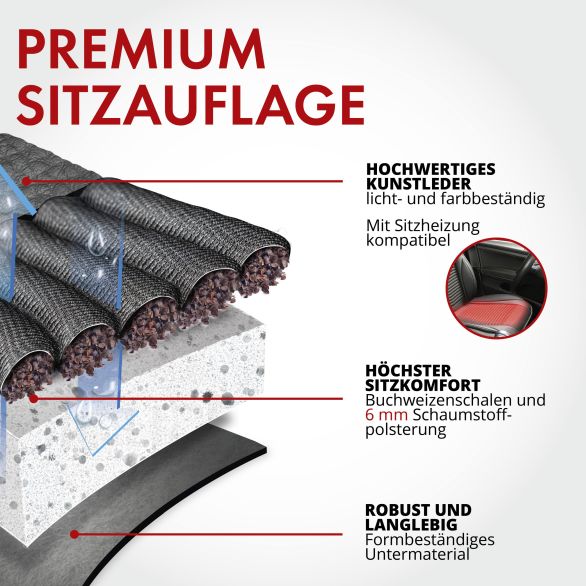 Der Sitzaufleger ist aus besonders hochwertigem Kunstleder und 3D-Mesh Material gefertigt und verleiht Ihrem Auto einen besonderen Look. Die einzelnen Rippen, gefertigt aus 3D-Mesh Material, sind mit Buchweizenschalen gefüllt und sorgen gemeinsam mit den festen Seitenwangen für ein angenehmes Sitzgefühl. Die 6mm Schaumstoffpolsterung erhöht den Sitzkomfort zusätzlich und schützt den Originalsitz. Zwei praktische Taschen sorgen seitlich für zusätzlichen Stauraum, wo Sie beispielsweise Ihr Smartphone verstauen können.