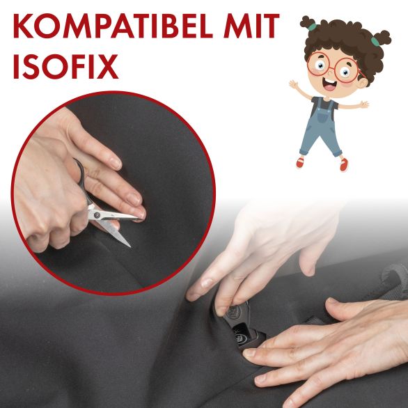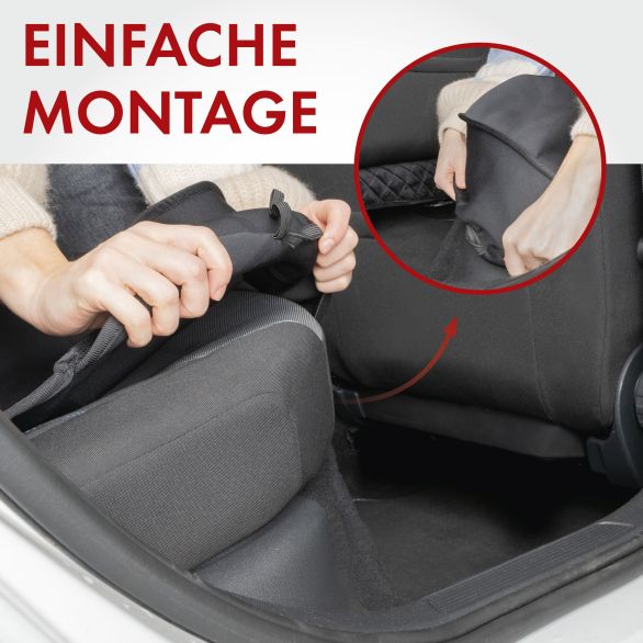 Der Rücksitzbezug Neopren wird durch den integrierten Kopfstützenbezug einfach über die Rücksitzbank gezogen und unter dem Sitz mit Haken befestigt. Dadurch ist er schnell zu montieren und auch wieder zu entfernen, sollte der Bezug einmal nicht mehr gebraucht werden. Zusätzlich sind Aussparungen für die Gurtschlösser vorgesehen, damit diese voll zugänglich bleiben. Wenn Sie einen Kindersitz mit ISOFIX Befestigung auf der Rückbank montieren wollen, schneiden Sie einfach eine kleine Öffnung an der Stelle der ISOFIX Halterungen in den Bezug.