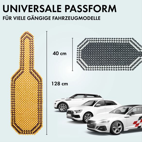 Die Sitzauflage aus Holzperlen bietet Ihnen auch bei langen Reisen hohen Sitzkomfort und macht das Reisen angenehm. Die Sitzauflage besteht aus großen Holzperlen. Mit den Maßen 128 x 40 cm reichen die Holzperlen von der Sitzfläche bis hin zur Kopfstütze. Die großen Perlen massieren verspannte und müde Muskeln und machen jede Fahrt angenehm. Die Perlen bestehen zu 100 % aus dem natürlichen Material Holz. Die Sitzauflage ist für alle gängigen Fahrzeuge mit und ohne Seitenairbag geeignet.