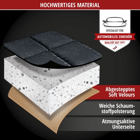 Der Sitzaufleger in der Farbe schwarz wird aus edel abgestepptem Velours gefertigt. Dieses Material ist strapazierfähig und schützt die Sitzfläche und Lehne der Rücksitzbank optimal vor Abnutzung, Flecken, Flüssigkeiten und weiteren Verschmutzungen. Zugleich fühlt sich der Velours Sitzaufleger angenehm weich an und lädt zum Wohlfühlen ein. Die 8 mm Kaschierung sorgt für hohen Sitzkomfort und ein luxuriöses Fahrgefühl während jeder Fahrt. Zusätzlich ist das Produkt auf der Rückseite anti-rutsch beschichtet.