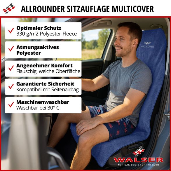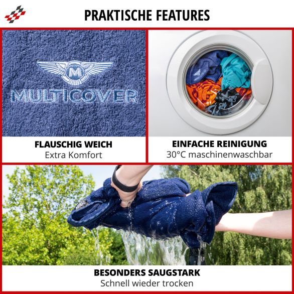 Das Multicover wird aus hochwertigem 100% Polyester gefertigt und ist bei 30°C waschbar. Das flauschig weiche Material ist atmungsaktiv und besonders saugstark, weshalb es Wasser gut aufnimmt und die Umgebung trocken hält. Zusätzlich ist das Multicover für Autositze mit integriertem Seitenairbag geeignet.