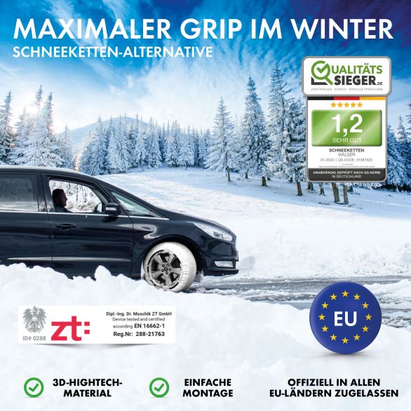 Unsere WALSER Schneekette "ULTRA GRIP" sorgen für hervorragenden Grip auf schneereichen und eisigen Straßen und sind Ihre schnelle Hilfe bei plötzlichem Schneefall. Sie können klein zusammengefaltet im Kofferraum mitgenommen werden und sind sofort einsatzbereit. Im Lieferumfang sind zwei "ULTRA Grip" Schneeketten enthalten. Sollte allerdings eine Schneekettenpflicht bestehen, ist die textile Schneeketten nicht zulässig.