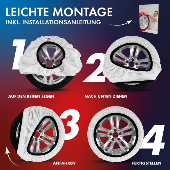 Wenn Sie von starkem Schneefall überrascht werden, muss die Montage schnell und einfach sein. Die Montage der "ULTRA GRIP" Schneekette ist mühelos. Platzieren Sie sie mit dem Pfeil in Fahrtrichtung auf dem Reifen, stülpen Sie sie von oben nach unten über den Autoreifen und bewegen Sie das Fahrzeug leicht vorwärts. Sobald der Reifen vollständig umhüllt ist, können Sie sicher weiterfahren. Beachten Sie jedoch eine Geschwindigkeitsbegrenzung von 50 km/h und verwenden Sie das Produkt ausschließlich auf schnee- oder eisbedeckten Straßen.